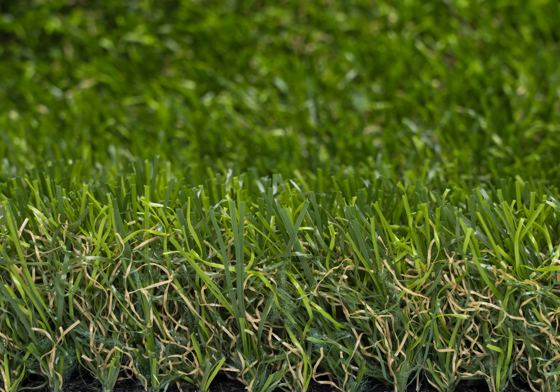 De kleurstelling van dit kunstgras bestaat uit vier verschillende kleuren draden, wat het bijna niet te onderscheiden maakt van echt gras. Deze variatie in kleuren, waarschijnlijk verschillende tinten groen, creëert een natuurlijke uitstraling met weinig glans, wat zorgt voor een zeer natuurgetrouw uiterlijk. De toevoeging van bruine kroesgaren versterkt de authenticiteit, waardoor het gras in elk seizoen een natuurlijke uitstraling behoudt.